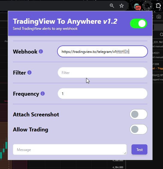 You should now see the extension interface similar to the one shown in the image below, with fields for Webhook, Filter, Frequency, and toggle options.